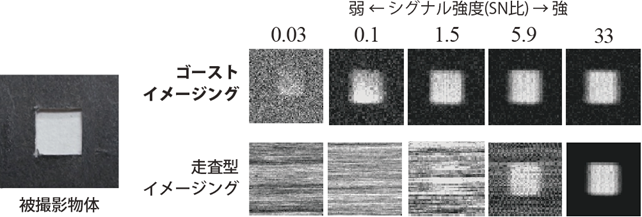 強度の揺らぎの相関を計算していることから、ロックイン検出と同じアナロジーであり、すなわち、ゴーストイメージングは耐ノイズ性に優れたイメージング法とも言える。図2に、走査型イメージングにより取得した画像との比較を示す。検出光強度のSN比が低くなるにつれてゴーストイメージングが優位であることがわかる。この耐ノイズ性に優れたイメージング法であることは、当初、非常に弱い相互作用である光子の空間的なもつれの検出に利用されていたことからもうかがえる[1]。また、渋谷らの報告で定量的に評価され明らかにもされている[11]