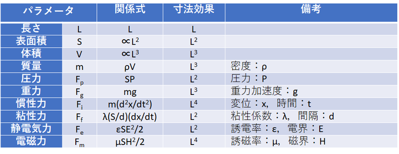 スケール効果あるいはスケーリング則とも呼ばれる。幾何学的に相似な物体において、作用する力等の特性が寸法変化によってどのように変化するかを示したもの。例えば物体の体積は寸法の3乗に比例し、表面積はその2乗に比例する(表1参照)。すなわち物体寸法が小さくなると表面力の影響が体積力のそれよりも大きくなる。例えば物体の寸法がマクロ領域からマイクロ領域になると、重力の影響よりも分子間力(ファン・デル・ワールス力)、液体架橋力(表面張力)、静電力(クーロン力)が大きくなることを指す。