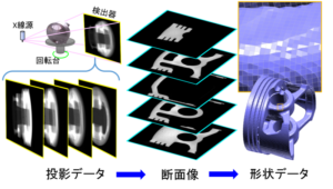 産業用X線CT ( Industrial X-ray CT ) とは、機械部品などの検査や寸法測定を行うにあたり、測定物に対して多方向からX線を照射して断面像を得る技術である。X線の透過を利用した測定方法であるため、物体の概形に加えて内部構造も測定可能な点が特長である。