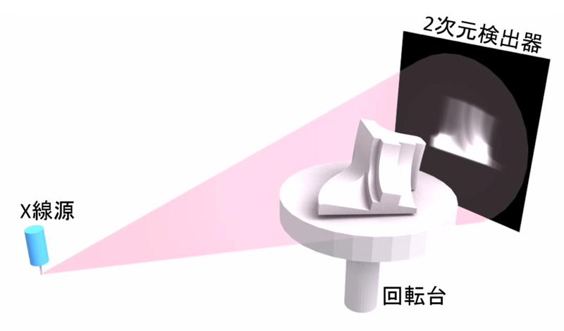 スキャンの方式としては、検出器が1次元のファンビーム型と、検出器が2次元のコーンビーム型が代表的である。図1にコーンビーム型方式の模式図を示す。ファンビーム型は1回転で1断面のみスキャン可能なのに対して、コーンビーム型は1回転すれば全ての断面にあたるボリュームを取得できるため測定スピードに関して大きなアドバンテージがある。一方で、検出器が1次元である場合にはX線の散乱線対策であるコリメータの構築が容易であり、特に散乱線の影響が大きい高エネルギX線源を用いる装置ではファンビーム型が採用されることが多い。