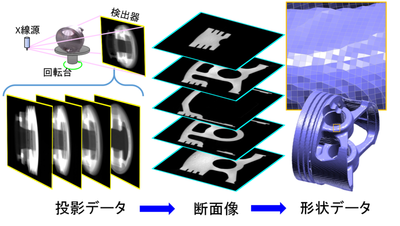 装置からの直接的な出力はX線の投影データ(サイノグラム)であり、計算機上でCT再構成[1]を行うことにより断面像(トモグラム)を得る。寸法計測のために形状データが必要な場合には、断面像上で注目する物体とそれ以外の領域の境界面をポリゴンメッシュとして抽出する。図2にこれらの処理の例を示す。