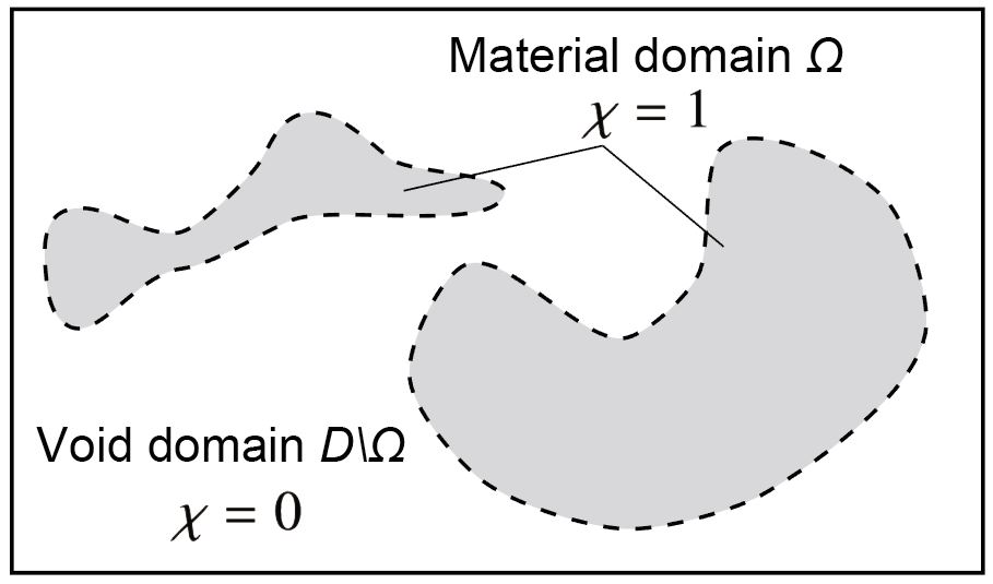 トポロジー最適化の基本的な考え方は、対象とする設計領域 \(Ω\) を包含する固定された設計領域(固定設計領域)\(D\) と,次式の特性関数 \(χ\) の導入にある[1-3]