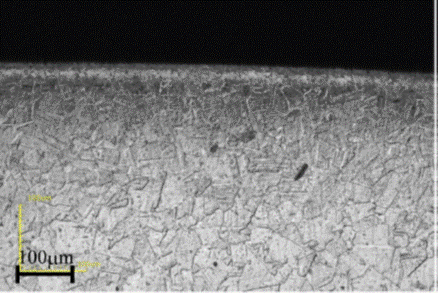 バニシング加工後の工作物表面には強い圧縮残留応力が付与されており、工作物表面にはバニシングによる改質層が生じます。これにより表面硬度の向上や耐摩耗性や疲労強度の向上といった表面改質硬化が得られます。図2はステンレス鋼(SUS306)にバニシング加工を付加し、断面を観察しやすいように腐食させて撮影したものです。表面からおよそ60マイクロメートルの深さまで、バニシング加工による結晶粒の微細化が確認できています。また高度向上や耐摩耗性向上、疲労強度向上と言った表面改質効果も同様の深さまで行えています。