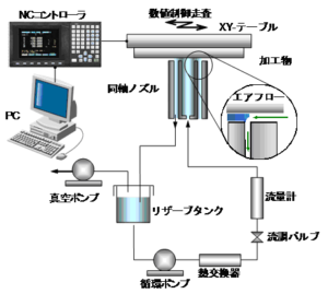 数値制御ローカルウエットエッチング装置 ( Numerically Controlled Local Wet Etching; NC-LWE ) の概略を図1に示す。本装置は、同軸ノズルヘッド、エッチャント吸引用真空ポンプ、循環ポンプ、リザーブタンク、熱交換器、加工物もしくはノズルを相対移動させるための駆動軸およびNCコントローラから構成される。
