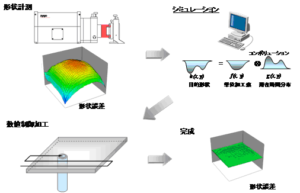 NC-LWEによる形状創成プロセスの概要を図2に示す。本プロセスでは、前加工面の形状を精密に計測して目的形状からの偏差量(誤差量)を求め、加工量はノズルヘッドの滞在時間、すなわちエッチャントの接触時間に比例するという原理に基づき、加工物上の各点における偏差量を最小にするためのワークテーブルの送り速度データを加工シミュレーションにより作成する。送り速度データはNCコントローラに転送され、テーブルの走査速度制御により形状修正加工を行う。加工後に再度形状測定を行い、形状誤差が許容値以内になるまで上記プロセスを繰り返して目標精度を達成する。エッチャントの温度および濃度の高精度制御は比較的容易であるため、バッチ間およびバッチ内におけるエッチングレートの再現性と安定性は高く、要求精度がサブマイクロメータレベルであれば通常は1回の数値制御加工により決定論的に目的形状が得られる。