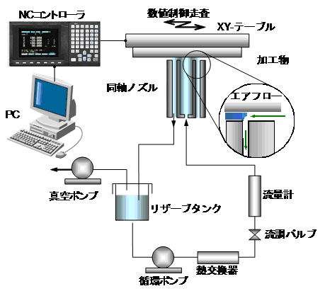 数値制御ローカルウエットエッチング装置 ( Numerically Controlled Local Wet Etching; NC-LWE ) の概略を図1に示す。本装置は、同軸ノズルヘッド、エッチャント吸引用真空ポンプ、循環ポンプ、リザーブタンク、熱交換器、加工物もしくはノズルを相対移動させるための駆動軸およびNCコントローラから構成される。