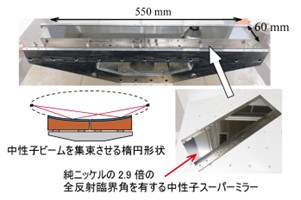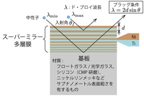 冷中性子線と呼ばれる低速の中性子線は、軽元素や同位体を高いコントラストで識別可能であるなど、電荷を持たない粒子ならではのユニークな特性を持ったプローブであり、物質構造解析をはじめ、イメージング、基礎物理実験まで幅広く利用されている。しかし、冷中性子線には線源から試料までの効率的な輸送が困難であるという問題がある。これは、冷中性子線がより高エネルギの中性子線を減速材に通すことよって実験に適した温度まで冷やすことで得られるという性質上、指向性がないためである。冷中性子線の輸送の問題を解決する中性子反射光学素子が中性子スーパーミラーである。中性子スーパーミラーはフェルミポテンシャルの差が大きい二種類の金属(最も一般的なものはNi/Ti)を、厚みを変化させながら交互に積層した金属多層膜であり、主にスパッタ装置で成膜される[1]。これら金属の各対層が異なるブラッグ条件を満たす中性子を反射するために、幅広い帯域の中性子を反射することが可能である(図1)。中性子実験施設においては、この中性子スーパーミラーを筒状構造の内壁に備えた中性子導管により、冷中性子線を線源から各実験装置まで輸送している。また、近年では高い形状精度を持つ平滑な曲面に中性子スーパーミラーを成膜することにより、試料に冷中性子線を集束させるための中性子集光ミラー[2-4]の開発も進められており、実際の中性子散乱実験装置にも実装されている[5](図2)。
