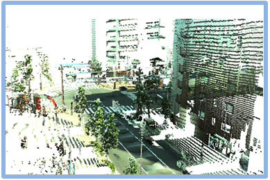 中・長距離レーザ計測で得られる点群の各点は、xyz座標値の情報に加え、レーザの反射強度 ( Intensity )、反射パルス番号 ( Pulse return number )、パルスの反射波形 ( Full waveform )、点の取得時刻(UTC時刻など)、サーマルセンサによる温度情報、ディジタル画像による色情報が付与される場合がある。点群は、オクル―ジョン(遮蔽)による欠損、高いレベルの計測ノイズ、物体境界付近における大量の異常値、大きな点密度差、不均一な点分布(スキャンライン)、莫大なデータ量(数千万点~数十億点以上)など、安定かつ高速なデータ処理を困難にする特徴を持つ。屋外環境では自然物と人工物が混在しており、スケールや形状の複雑さが大きく異なる物体が点群内に含まれている(図1)。