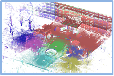 図2 屋外計測点群のレジストレーション(各色が個々の点群を表す)