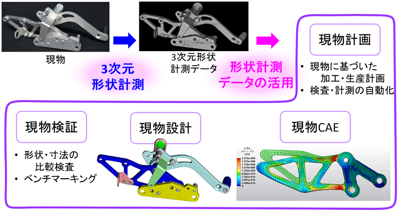 現物融合型エンジニアリングは、近年、製品製造のデジタル化が進むにしたがって現れた比較的新しい分野である。その背景には、CAD・CAEなどコンピュータを用いた製造支援技術が一般化するにつれ、より高度なものづくりを求めて、現物の情報を製造に取り入れようとする動きが高まってきたことが挙げられる。現物の計測データを用いることでものづくりの高度化が期待される場面としては、例えば、製品現物の形状モデルを用いて正確な物理シミュレーションを行いたい、アセンブリ品の組み付けの様子を確認したい、試作品の形状をCADモデルに反映することで、製品の形状設計にかかる時間と手間を削減したいなどといったものがある。また、複合材料等の未知の材料や新規な製造プロセスの出現・技能者不足などにより、従来のノウハウが通用せず、計測による現物のデータ化が必要とされる場面も出てきている[1]。