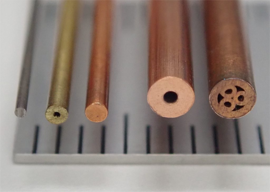 図4に市販されている電極の一例を示す。左から、WC-棒、黄銅-パイプ、銅-棒、銅-パイプ、銅-特殊形状、である。