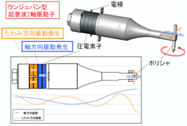 ランジュバン型の圧電素子を2重に重ねることにより2軸振動する超音波振動子を開発している(図1)。また近年需要が高まっている青色レーザピックアップレンズ用金型のように高NA非球面(高傾斜角をもつ)金型に対する自動超精密研磨加工に対応するために、この超音波2軸振動子を同時4軸(X,Y,Z,B)制御駆動テーブルに搭載し、非球面研磨システムを開発している(図2)。