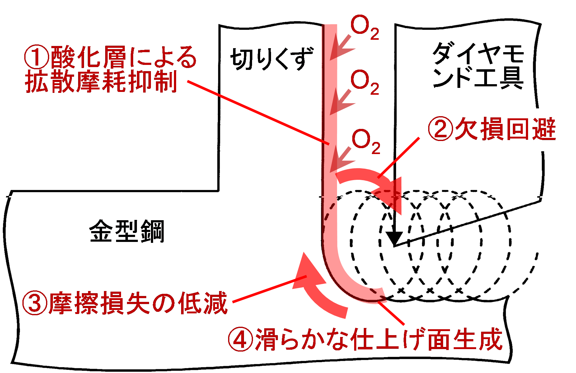 従来、主に切削方向の超音波振動を付加しながら間欠的に切削を行うことで、鋼のダイヤモンド切削が可能になることが報告されている[1]。その後、この方法を超精密加工に応用できることも実証された[2]が、その原理(ダイヤモンド工具の摩耗が抑制される原因)については、長年はっきりしなかった。最近になって、高真空中でこの摩耗抑制効果が失われる実験結果より、振動周期毎に活性な新生面が空気に暴露することで摩耗を抑制する保護層(図1の①)を生じることが明らかになっている[3]。