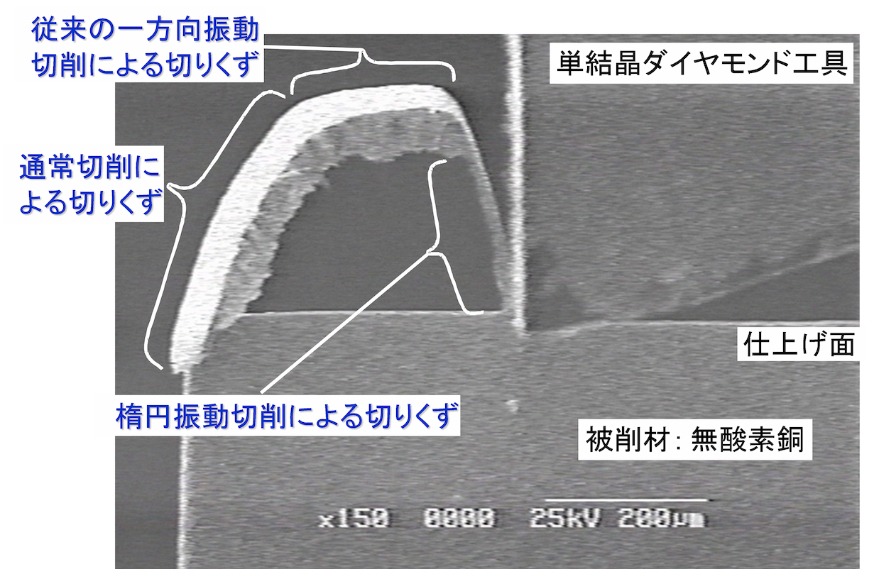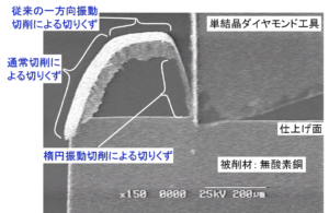 上記のように超音波振動切削によって鋼の超精密切削が実現したものの、その実用化は進まなかった。その理由の一つは、振動方向と切削方向の関係がプロセスに大きな影響を持つことと考えられる。図1において、工具が切りくずから離れる際に仕上げ面からも離れるように振動すると、仕上げ面がのこ刃状となり虹面を呈する。逆に仕上げ面に近づくように振動すると、逃げ面が干渉して引張応力を生じ、切れ刃に欠損を生じる。これらの相反する問題を避けるように3次元的な切れ刃に対する振動方向を微調整することは実用的でなく、さらに切削方向を変化させながら複雑形状を創製することができないことも短所である。