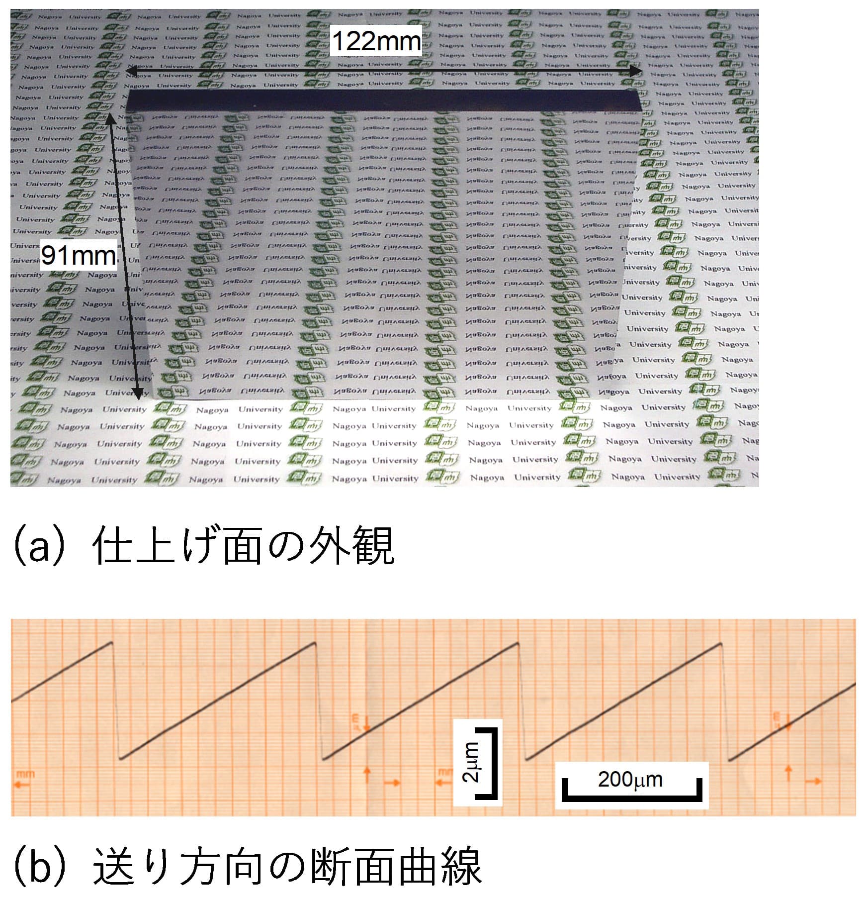 上述のように振動周期毎に間欠的な切削を行うには、見かけの切削速度に対してその方向の振動速度が十分に高い必要がある。そのため、実用的には振動周波数を超音波領域とし、振動速度を増すことで切削速度を実用領域に近づけるが、それでも振動速度の限界から数メートル毎分以下の速度で実加工が行われている。この速度は旋削では低いものの、非回転工具を用いた微細加工や自由曲面加工では十分に実用的である。その応用として、例えば図3に示すように、金型鋼の超精密微細加工が実現し、実用的な加工技術として普及している[7]。