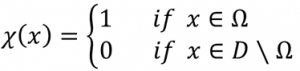 トポロジー最適化の基本的な考え方は、対象とする設計領域 \(Ω\) を包含する固定された設計領域(固定設計領域)\(D\) と,次式の特性関数 \(χ\) の導入にある[1-3]