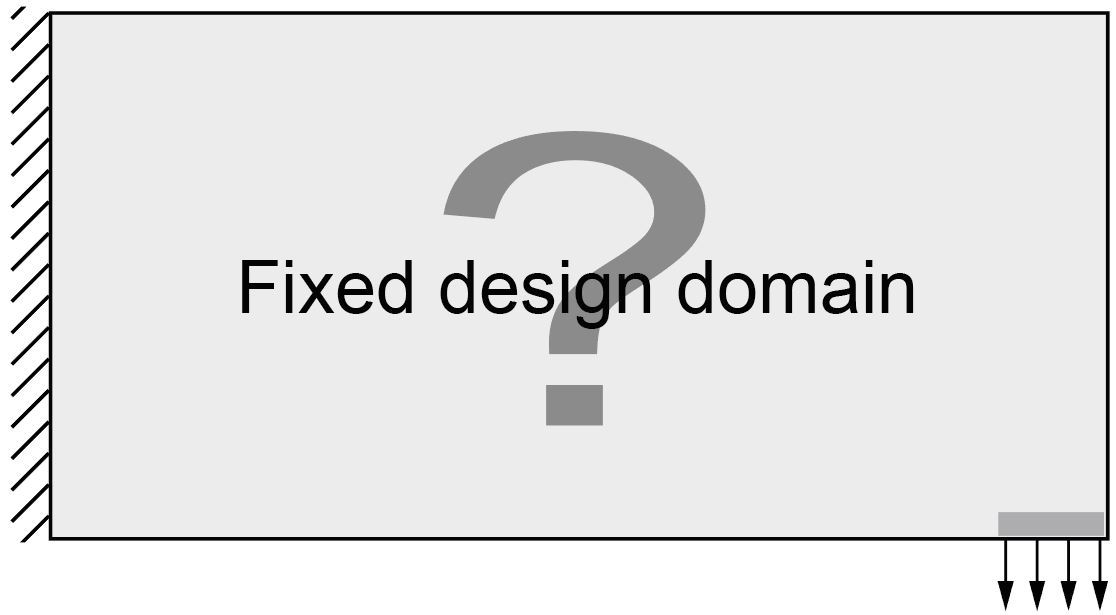 ここで、\(x\) は固定設計領域における任意の位置座標を表す。特性関数 \(χ\) は固定設計領域 \(D\) における材料の有無を表していることから、\(χ\) に関する最適化問題を考えると、トポロジー最適化は固定設計領域における材料分布問題に帰着される。これにより、固定設計領域において任意の形状と形態を表現することができる(図1)。