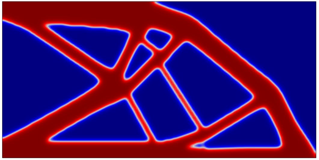 図2に示すように、左端を固定し、右下端に荷重を付加した片持ち梁を考える。ここでは片持ち梁の体積を固定設計領域の40%以下とする制約条件を与えた上で、構造物の剛性を最大化することを目的としている。密度法に基づくトポロジー最適化によって得られた最適構造を図3に示す。剛性最大化問題はトポロジー最適化のベンチマークとして用いられることが多い。