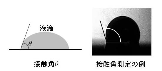 濡れ性は接触角(図1)の大小で評価されることが多い。一様な固体表面上に液滴が形成されると、液滴外縁部(接触線)の接線と表面がある平衡角をもった球帽形となる。この平衡角のことを接触角と呼び、接触角が小さいほど濡れ性が良い、あるいは親液性が高いと称する。