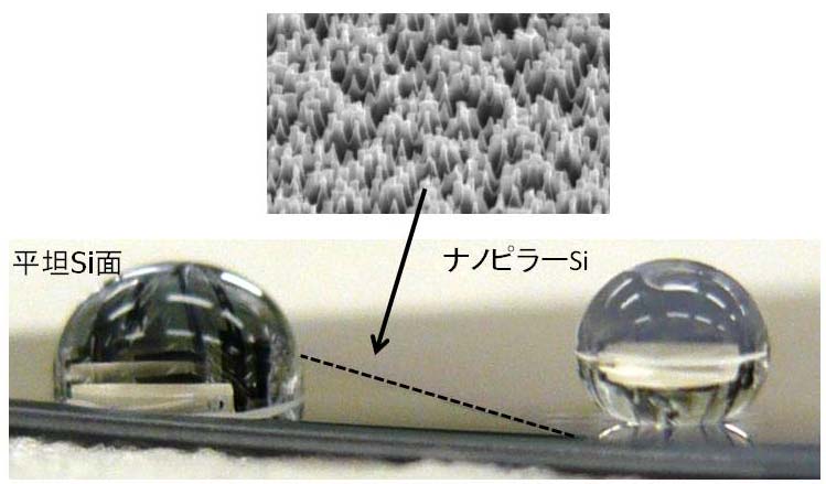 固体表面に特定の被膜を形成する、微細形状を作製する、あるいは両者を組み合わせることで濡れ性は制御できる。例えば、平滑なSiウェハ上での水接触角は80°以下であるが、オクタデシルトリクロロシラン(OTS)で被覆したナノピラー構造上では150°以上となる(図2)。固体表面を異種材料や幾何形状でパターンを形成すると、その形状に応じた複雑な濡れや液滴移動を生じさせることが可能である[1]