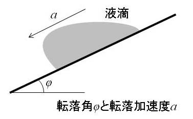 実用的な表面では液滴をすばやく除去したいなどの要求があり、上記の接触角のような静的な濡れ性だけではなく、動的な濡れ性を評価することも必要である。動的な濡れ性は転落角や転落加速度が指標となる。転落角は固体表面上で静止していた液滴が移動し始める傾斜角であり、転落加速度は移動している液滴の加速度である(図3)。
