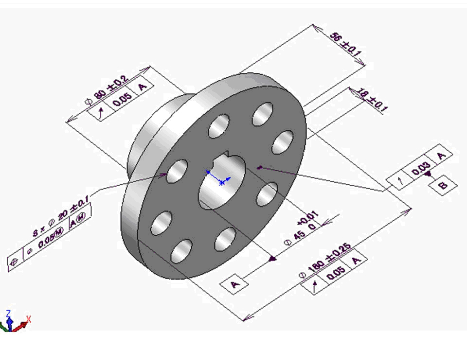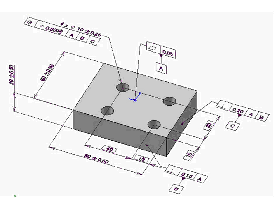 モノづくりでの分野では、設計から製造への情報伝達として3DCADで定義した形状モデル(以後、3Dモデルと記す)と、公差や注記を記入した2D図面が普及している。3D-CADの利用拡大と高機能化により2D図面でしか表現することができなかった寸法公差、幾何公差、注記、表面性状などの製品特性を3Dモデルに、直接、定義することができるようになってきた。3Dモデルに製品情報を定義する規格として、2003年7月にASME Y14 -41[2]が発行され、それを基にISO16792[3]が発行された。(社)日本自動車工業会(電子情報委員会デジタルエンジニアリング部会)と(社)日本自動車部品工業会(電子情報化委員会CAD部会)では2007年8月に、ASMEやISOの規格に準拠して3D単独図ガイドライン[4]を発行した。さらに、2007年12月には(社)電子情報技術産業協会(3次元CAD情報標準化専門部会3D単独図標準化分科会)から3D単独図ガイドラインDraftが発行された[5]。このように、モノづくりための情報伝達は2D図面から3D単独図へ移行し始めている。この動きに連動するように、3D-CADでは、3Dモデルに製品特性(データム、基準寸法、寸法公差、幾何公差、最大実態状態、表面性状など製造や検査に必要なもの)を自動的に配置する機能を開発してきた。具体的には、設計者がデータムのみを指示すれば、基準寸法や幾何公差を自動的に配置することができるようになった。図6と図7にそのサンプルを示す。 図6は直方体に4つの穴が貫通しているサンプルである。この形状を製作するために直交する三つの平面をデータム(図中のA,B,C)に選ぶと、3D-CADは貫通穴の寸法や幾何公差を図のように自動的に配置する。一方、図7はフランジの形状である。これは回転体なので、回転中心にある貫通穴の円筒面が第一データムになる(図中のA)。このデータムと直交するフランジ面を第二データム に選ぶと、必要な寸法や幾何公差を図のように自動的に配置する。