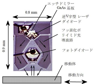 図1の集積化レーザドップラ速度センサは、光のドップラ効果を用いて、対象物の速度を計測するセンサで、GaAs基板上にレーザダイオード・フォトダイオード・光導波路を半導体プロセスを用いて作り込むことにより1mm角以内に集積化したセンサである。従来のレーザドップラ速度計測器に比較して1/100以下のサイズである。測定対象を毛細血管内の赤血球とすることで、非侵襲な血流計にも応用されている。従来の光計測器は、光部品を光路上に正確に配置(アライメント)する事が難しく、サイズ・コストが大きくなりがちであった。これに対しMOEMS(光マイクロマシン)は、設計通りに基板上に一度に形成されるため、上記光部品アライメントを廃することができ、小型化・低コスト化が可能である。MOEMSの例としては、他にマイクロエンコーダ(変位センサ)・波長可変レーザなどがある。製品化された例としては、プロジェクタ用マイクロミラーデバイスが挙げられ、半導体プロセス用マスクレス露光装置にも使われている。